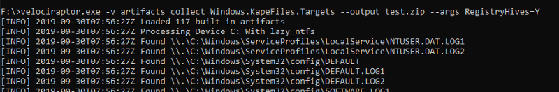 F:> velociraptor.exe -v artifacts collect Windows.KapeFiles.Targets --output test.zip --args RegistryHives=Y