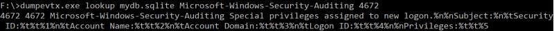 F:\\>dumpevtx.exe parse --messagedb mydb.sqlite c:\\Windows\\System32\\winevt\\Logs\\Security.evtx