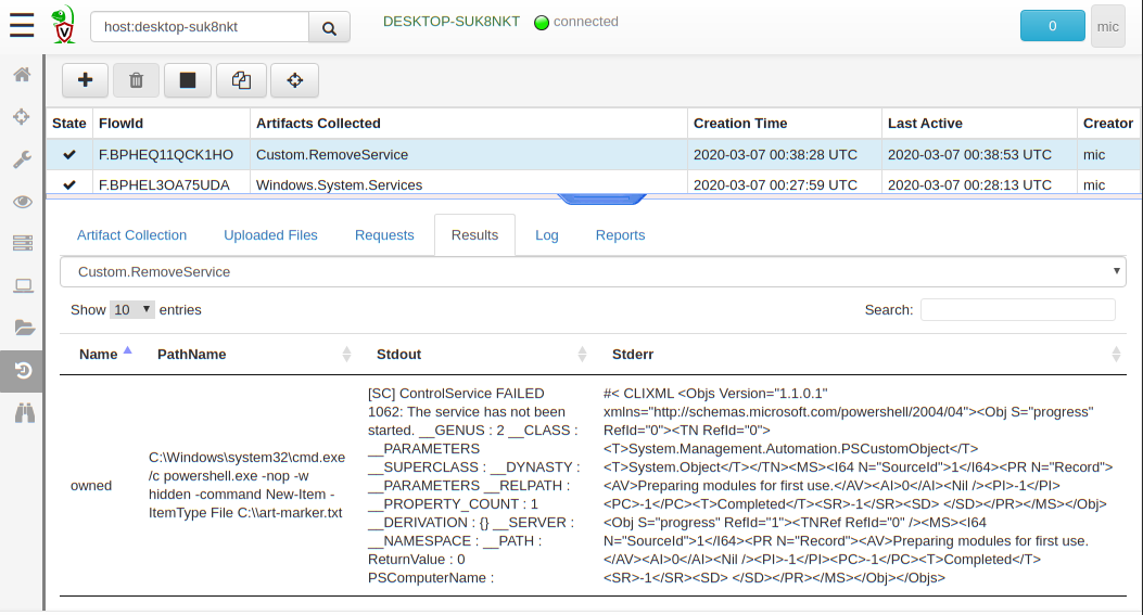Now when collecting the artifact, we can see which machines had the malicious service installed, and how the removal went. We can then collect the Windows.System.Services artifact again to check that services were correctly removed.