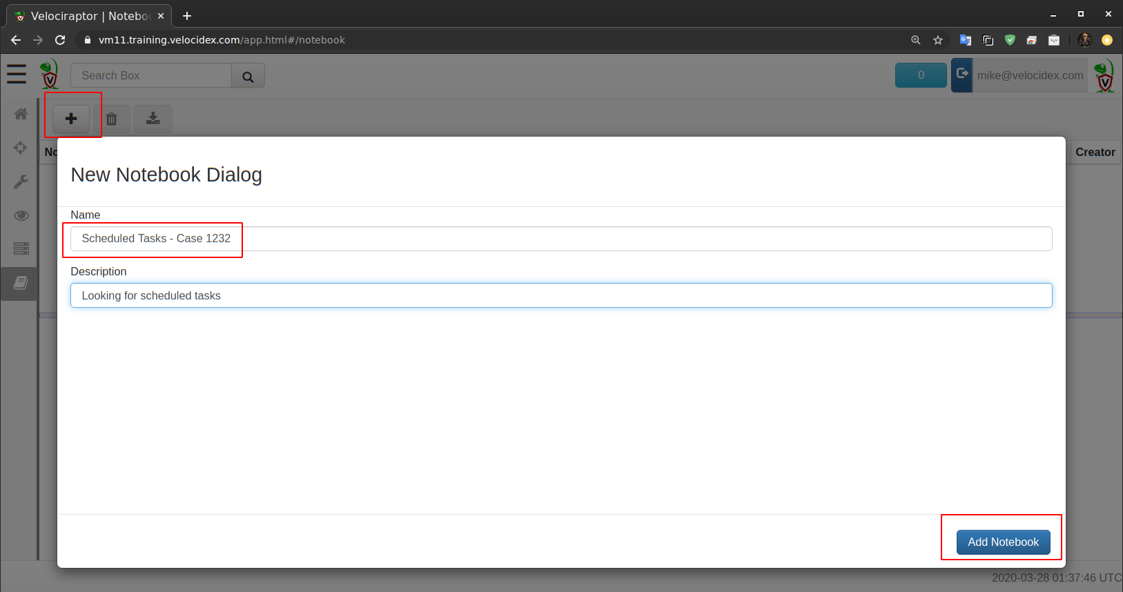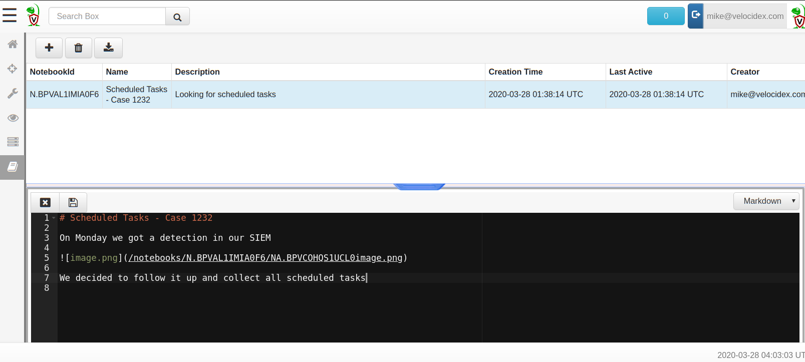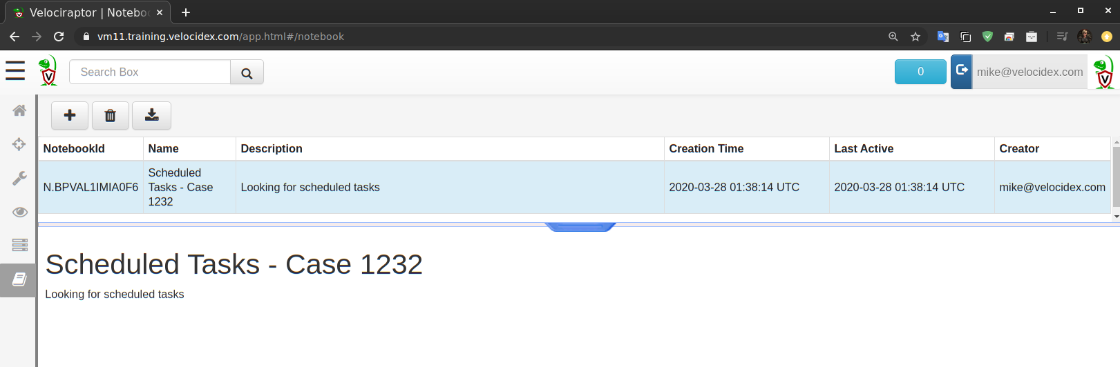 We will name our notebook “Scheduled Tasks — Case 1232”, and add a useful description. Clicking the “Add Notebook” button will create the new notebook which will now be visible in the top pane, and we can see an initial notebook created on the bottom pane.