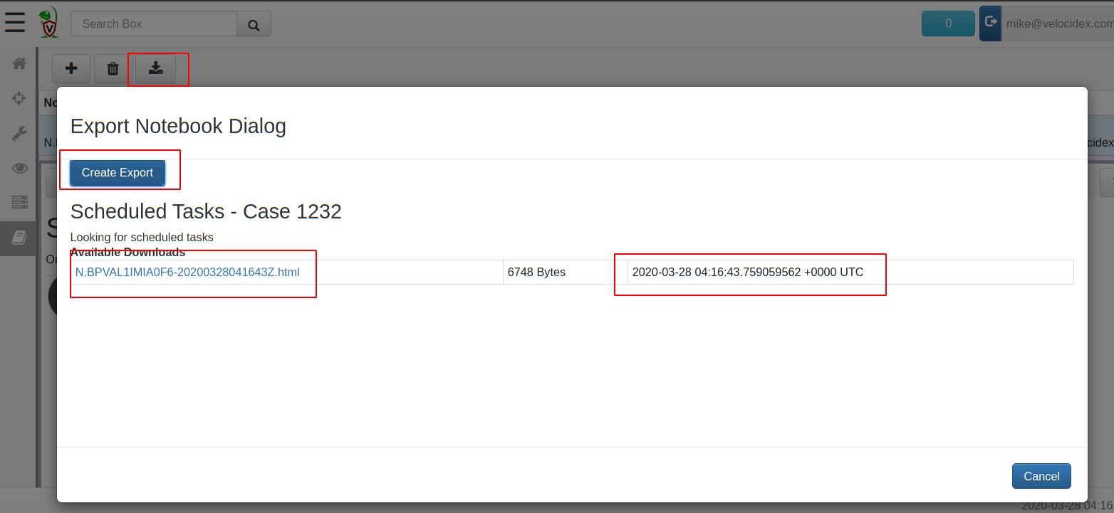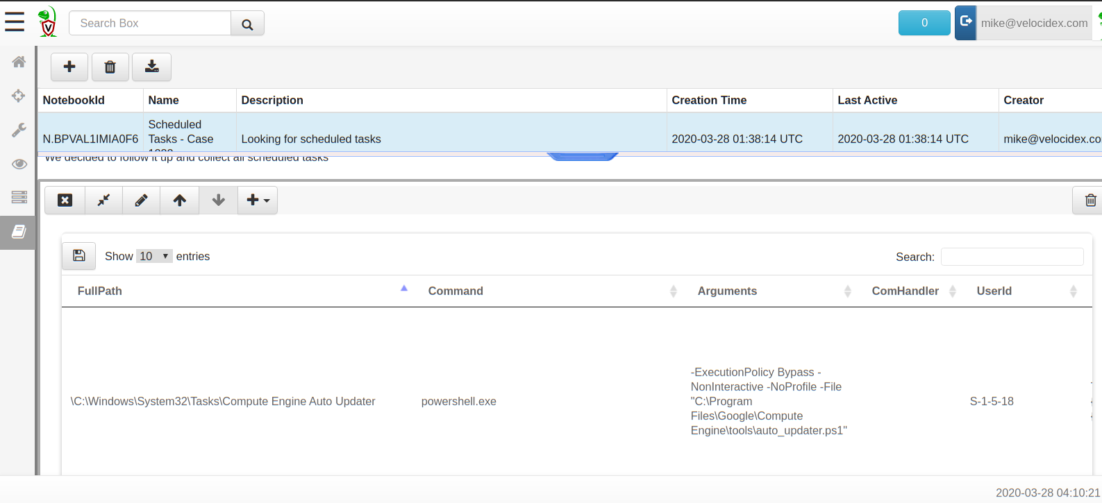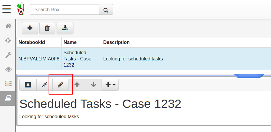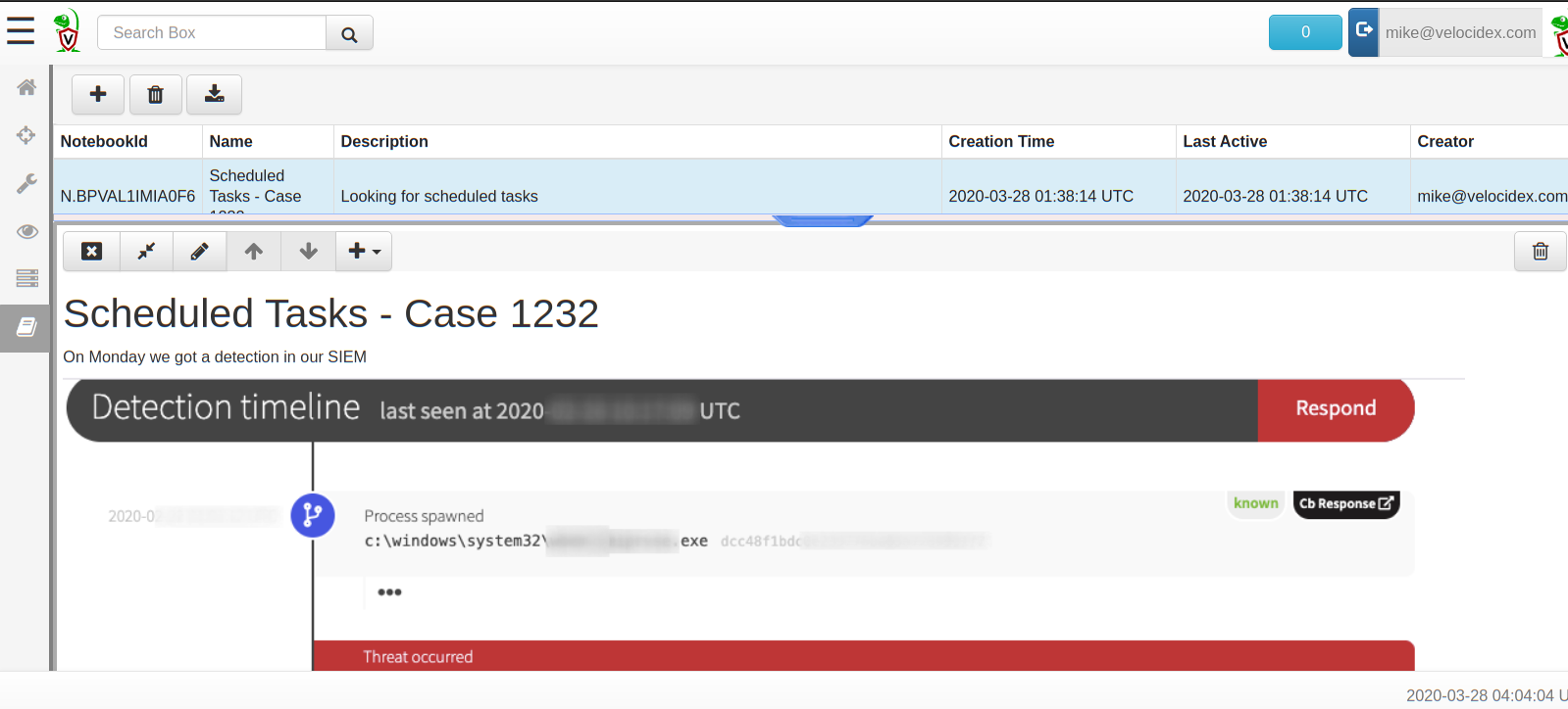 We will name our notebook “Scheduled Tasks — Case 1232”, and add a useful description. Clicking the “Add Notebook” button will create the new notebook which will now be visible in the top pane, and we can see an initial notebook created on the bottom pane.