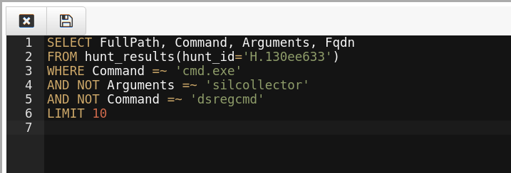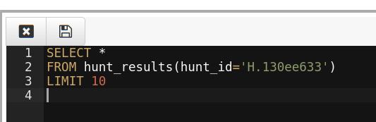 Selecting the hunt and clicking OK will produce a new VQL cell, already populated with the basic query we need to run to see the results of the hunt. Note that we always use the LIMIT clause to prevent the GUI from processing too much data. At this stage we only want to see the first 10 rows until we can refine our query.