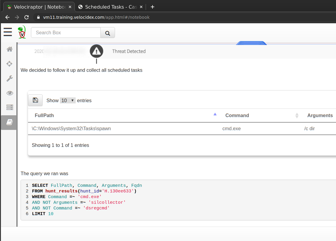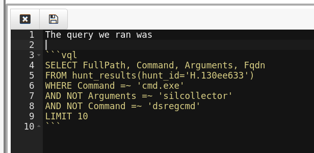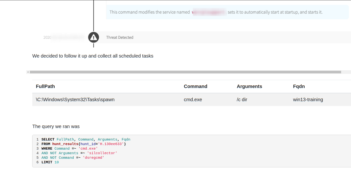 In practice we can now add more markdown cells to explain our findings, implement remediation hunts to remove the malicious scheduled task etc. We can even include the VQL we ran in the report by using markdown code blocks.