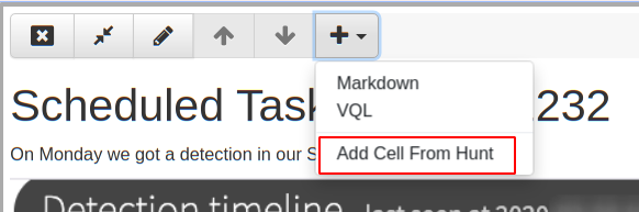 Next we need to post process the scheduled tasks we collected earlier in a hunt. Clicking the “Add Cell” pulldown provides a number of options — in our case, we want to add a cell from an existing hunt.