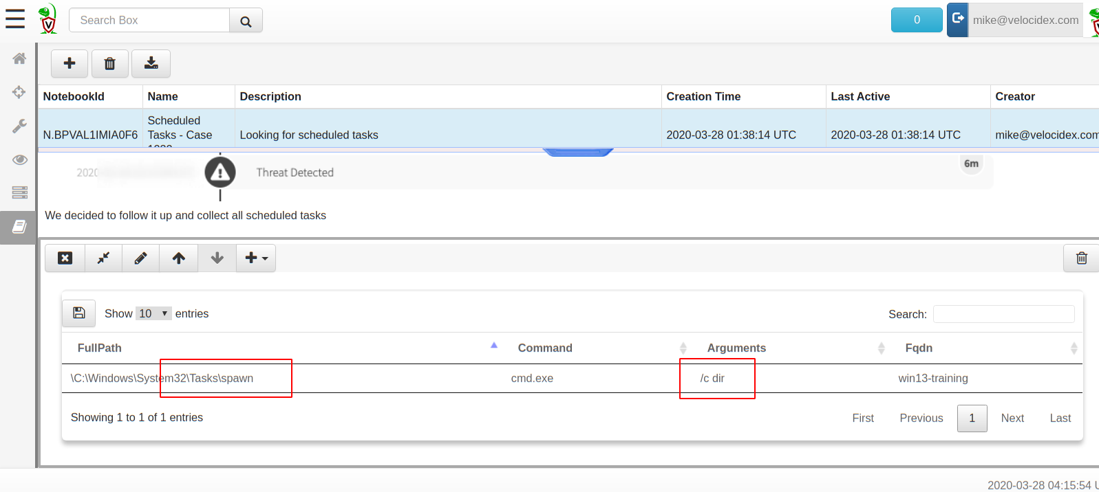 We can now refine the columns we see by specifying them in the VQL query. In our case we only wish to see FullPath, Command, Arguments and Fqdn (The hostname of the endpoint). We know that our alert was for executing “cmd.exe” so we narrow our query to only see scheduled tasks with the cmd.exe command (WHERE Command =~ “cmd.exe”).