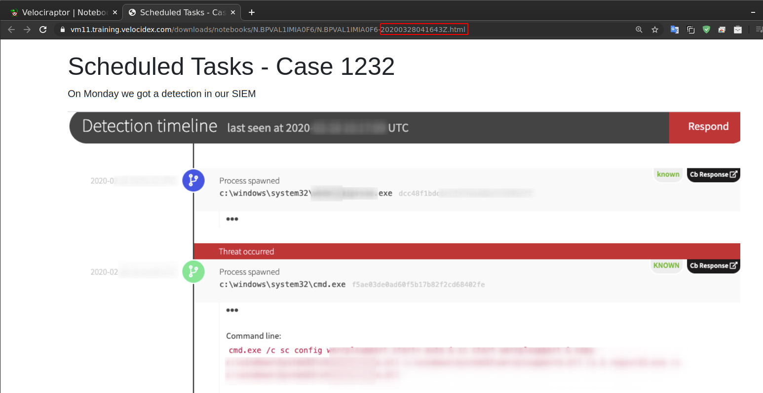 For these reasons, Velociraptor allows users to export the notebook into plain HTML. The HTML export is a point-in-time export, as the investigation proceeds and new information becomes available, the same notebook may be exported again and again, each version revealing new findings.