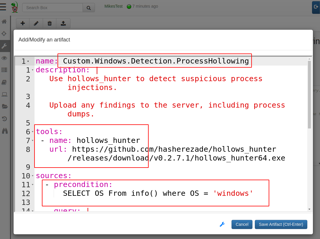 Next I will declare that this artifact needs the hollows_hunter tool. Velociraptor will ensure this tool is available on the endpoint when the artifact is collected. The tool’s name is simply a string that I will use to refer to the tool below. It will be automatically added to Velociraptor’s inventory of external tools.