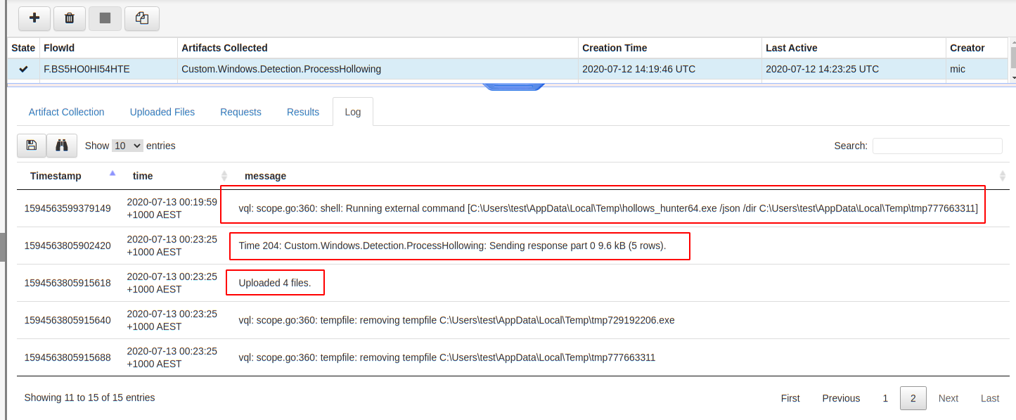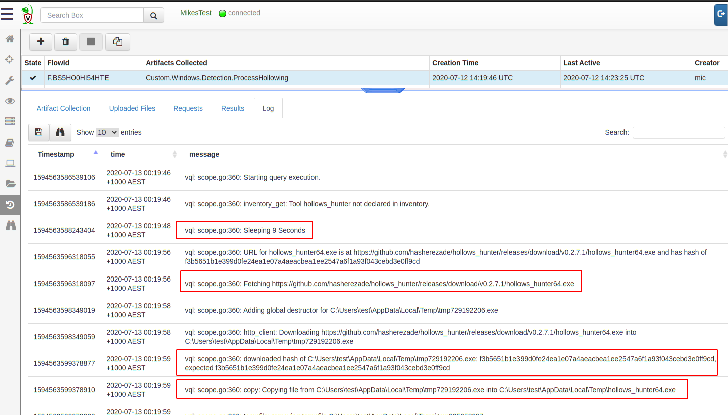 We can see that Velociraptor knows the hash of the hollows hunter tool and it also keeps a copy of the binary in the filestore under a special obfuscated name.