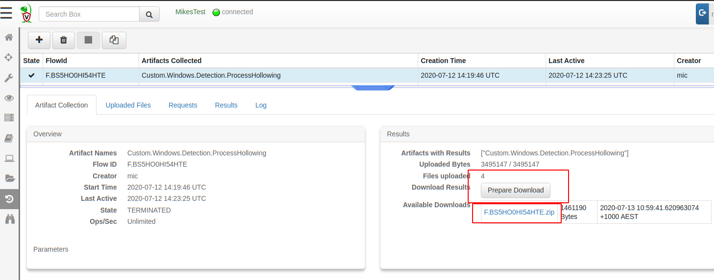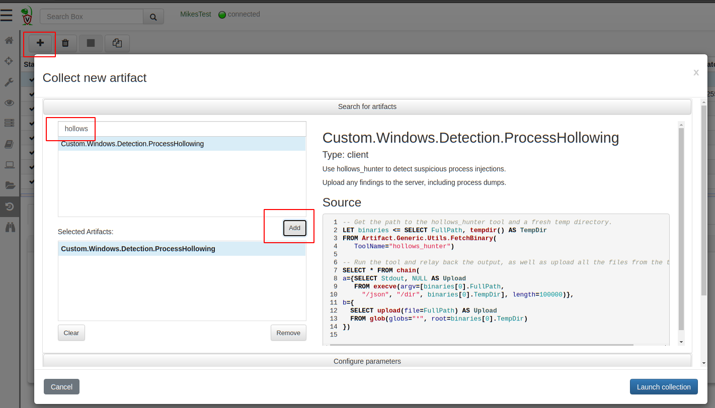 Now let’s test this artifact by collecting it from our test VM. Simply search for the hostname in the search box, and view the* “Collected Artifacts”* pane to see previously collected artifacts. Click the “Collect new artifacts” button and search for our newly created hollows hunter artifact.