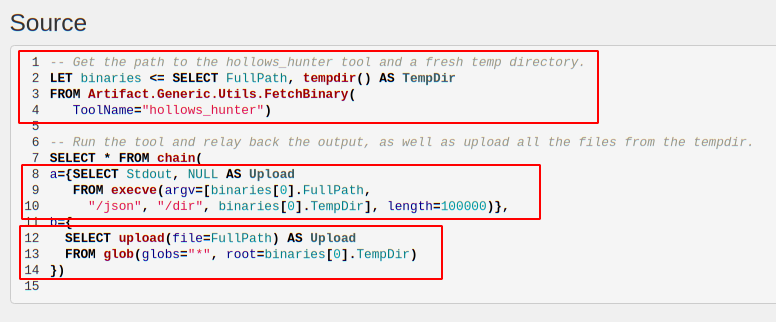 Now we are ready to write the VQL that will use the tool. The VQL will run on the endpoint during collection and will need a valid path to the hollows hunter executable. Velociraptor will manage uploading the executable to the endpoint and caching the binary locally, ensuring its hash does not change over time. To make this process as easy to use as possible, as far as the artifact writer is concerned, they simply need to call the “Generic.Utils.FetchBinary()” artifact to get a path to the local binary.