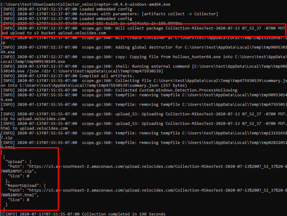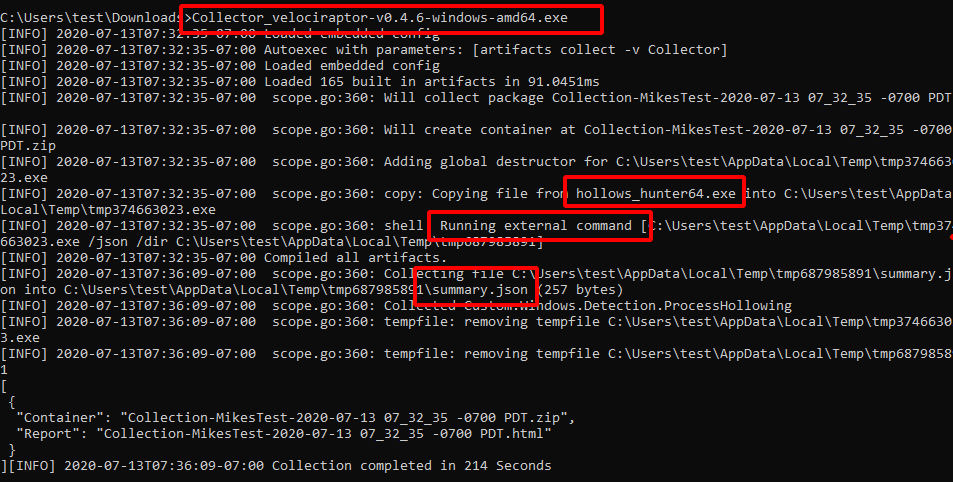 We can see that the hollows_hunter64.exe binary is copied into a temp file, executed and its results uploaded into the zip file. All temp files are cleaned up after collection.
