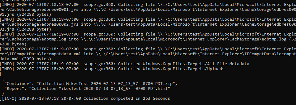 Simply running the binary will begin to collect all the artifacts we specified — in this case the KapeFile Basic Collection target. Finally an output Zip file and a HTML report will be produced using the hostname and timestamp.