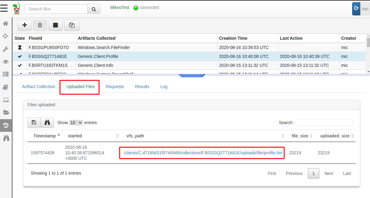 By default the profile is taken over 30 seconds, after which it is uploaded to the server like any uploaded file. I can simply download the profile from the Uploaded Files tab by clicking the link.