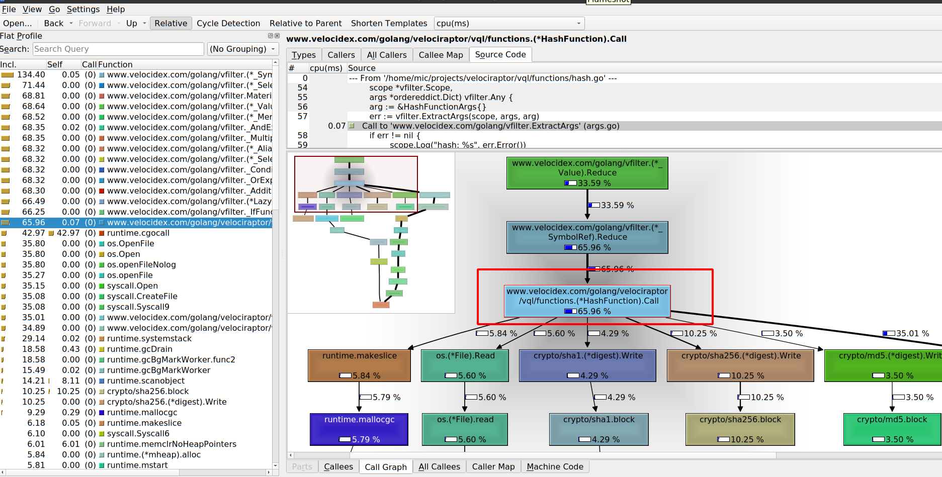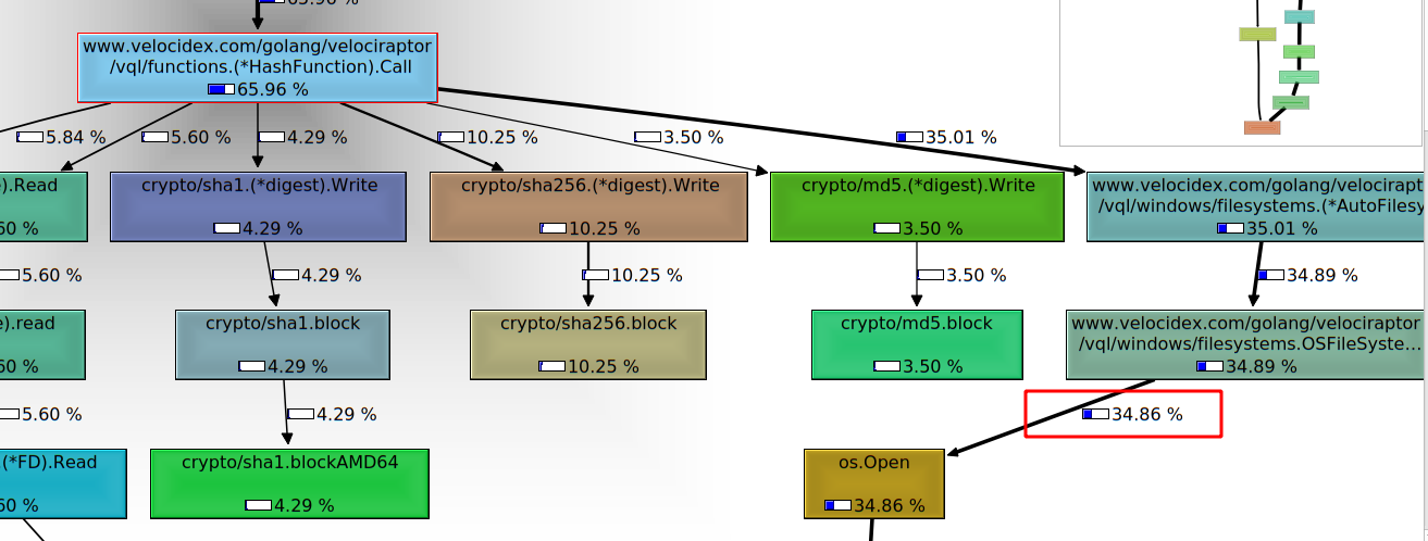 The kcachegrind tool allows me to interactively inspect the relative CPU time spent on each function. In the screenshot above we can see the left pane showing the relative amount of time taken by each function. The bottom right pane shows an interactive call graph visualizing how each function spends its time. In this case we can see the HashFunction.Call() function is responsible for 65% of the time spent. In turn it spends about 5% of CPU time reading the file, 4% calculating the sha1, 10% the sha256 and 3.5% the md5 hashes. (The exact numbers will depend on the actual set of files present on the endpoint)