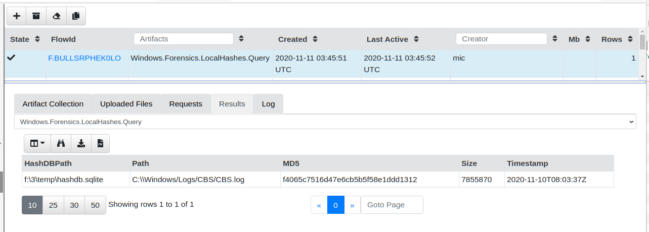 You can now easily page through the data viewing the hashes and files that were added since the query started. You can also download the entire SQLite database file from the endpoint, or watch the events on the server for specific file types or hashes found across the entire deployment.