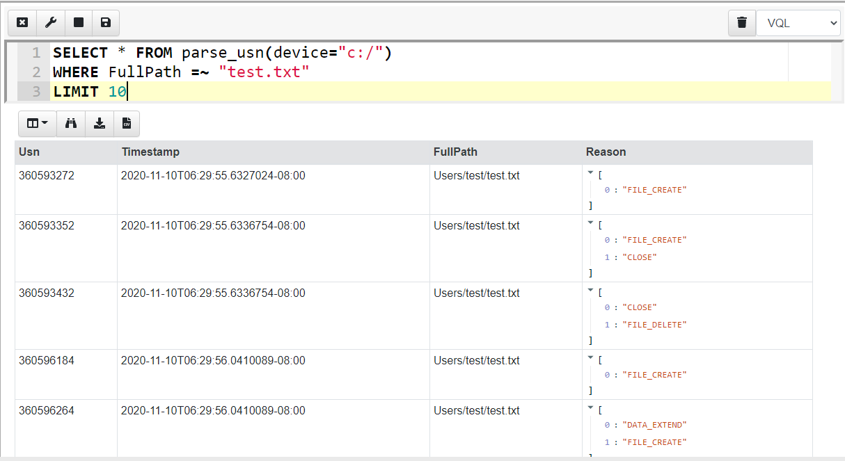 When a program interacts with a file, we typically see a bunch of related filesystem events. For example, I can create a new file called test.txt using notepad and write some data into it. I can then query the USN journal for modifications to that file (The =~ operator is VQL’s regex match)…