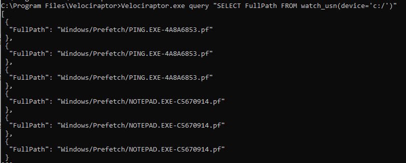 As filesystem changes occur they are picked up by the watch_usn() plugin and reported a short time later. This allows us to write queries that respond to filesystem events in near real time.
