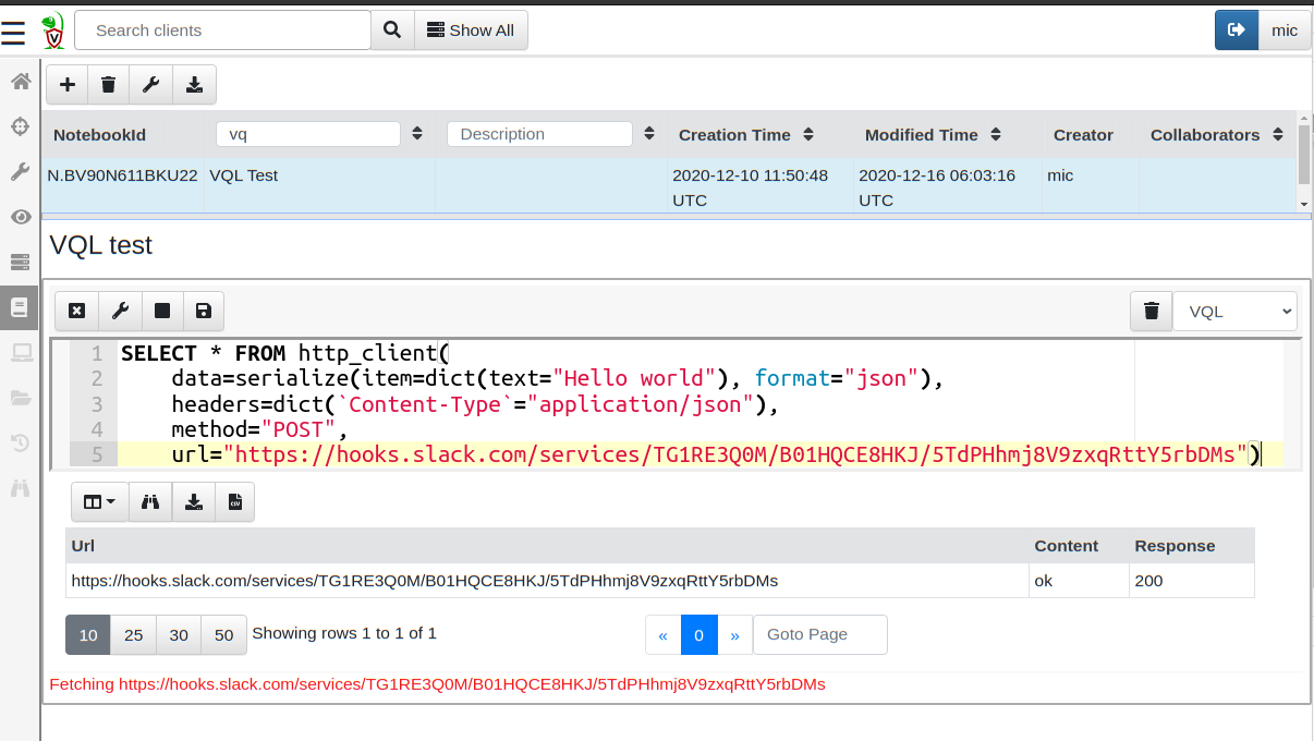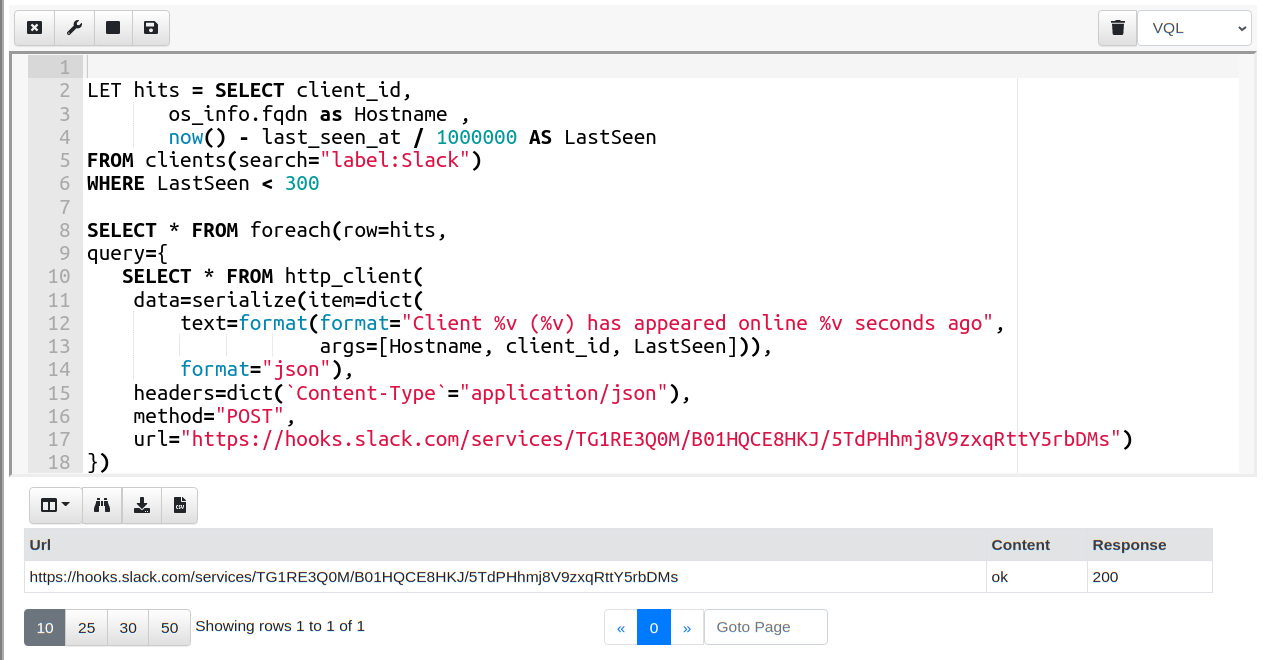 Here I am just replicating the curl command line above using VQL’s http_client plugin. Once I save the cell, Velociraptor will make an API request to the slack servers and my message will appear in the alerts channel.