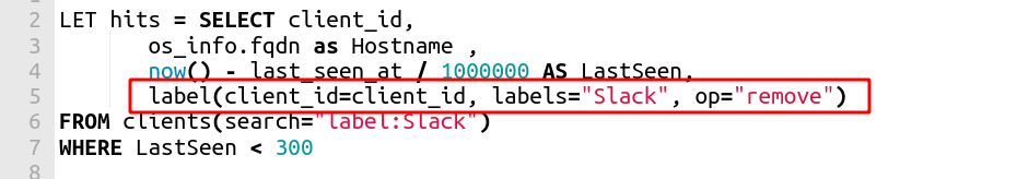 I can quickly retrieve the clients in the “Slack” label group by using the clients() plugin and applying a search expression “label:Slack”. Note that searching the clients by label in this way is much more efficient since it uses the label index rather than a row scan over all clients.