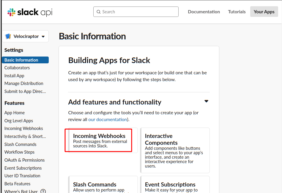 Since I just want Velociraptor to inform me about events, it really only needs to push messages. I will therefore select the “Incoming Webhooks” app type.
