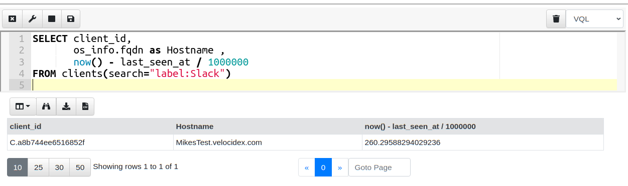I am using the now() VQL function to return the number of seconds since the epoch. The client’s last_seen_at time is given as microseconds since the epoch so I quickly convert it to seconds.