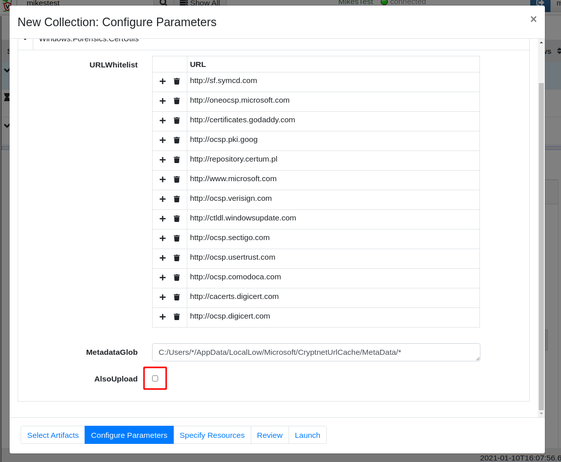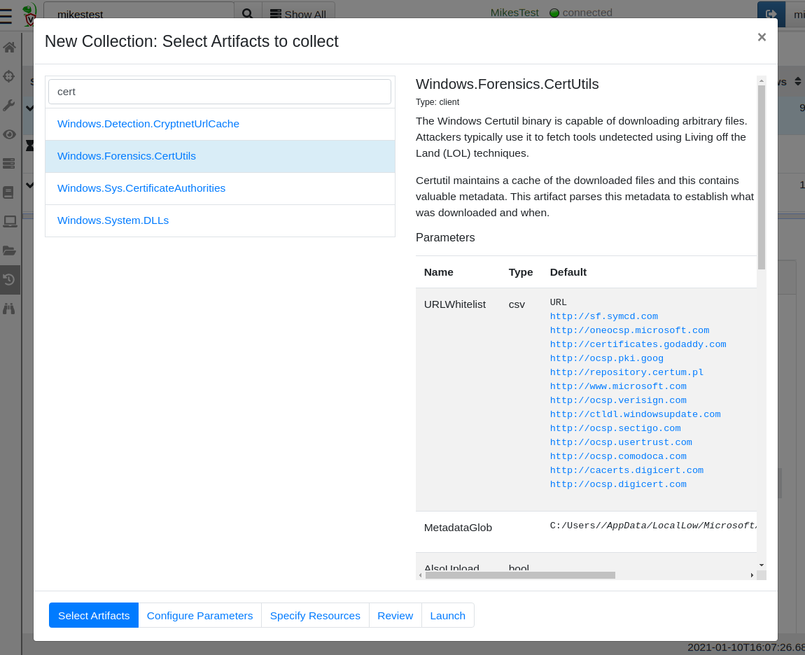 I will now collect the artifact from my endpoint. Using the GUI, I click the add new collection button, then search for my Windows.Forensics.CertUtil artifact.