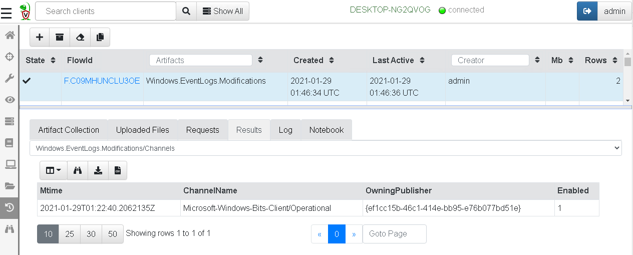 Within 2 seconds we see that the BITS admin channel was manipulated within the previous day