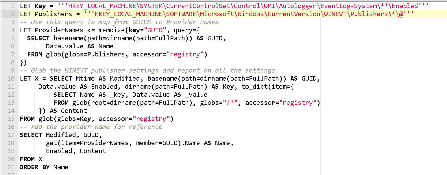 This VQL also resolves the GUID to a provider name via the HKEY_LOCAL_MACHINE\SOFTWARE\Microsoft\Windows\CurrentVersion\WINEVT\Publishers\ key as well as showing the modification time of the registry key in question.