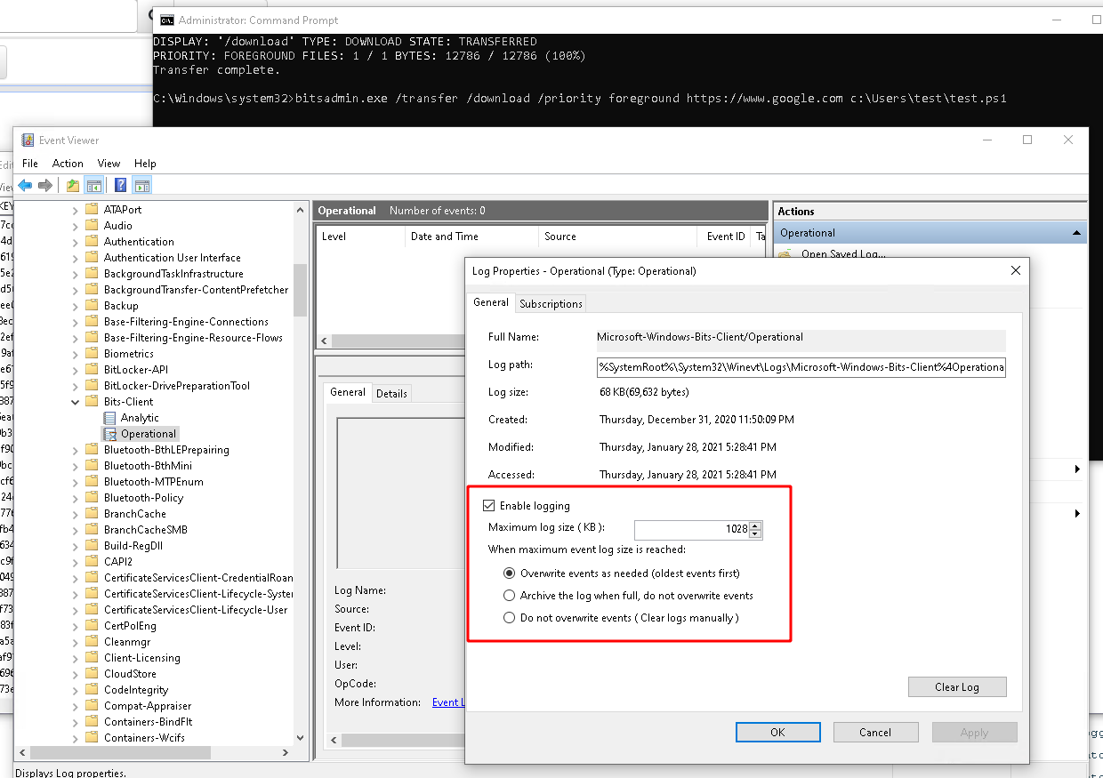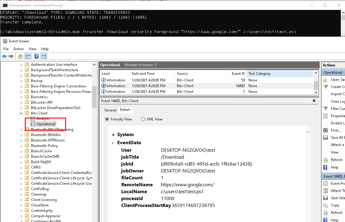 For this test I will use bitsadmin to download a page from the internet and store it on the filesystem. By default, the BITS service will generate several log messages in the log file %SystemRoot%\System32\Winevt\Logs\Microsoft-Windows-Bits-Client%4Operational.evtx as shown in the screenshot below