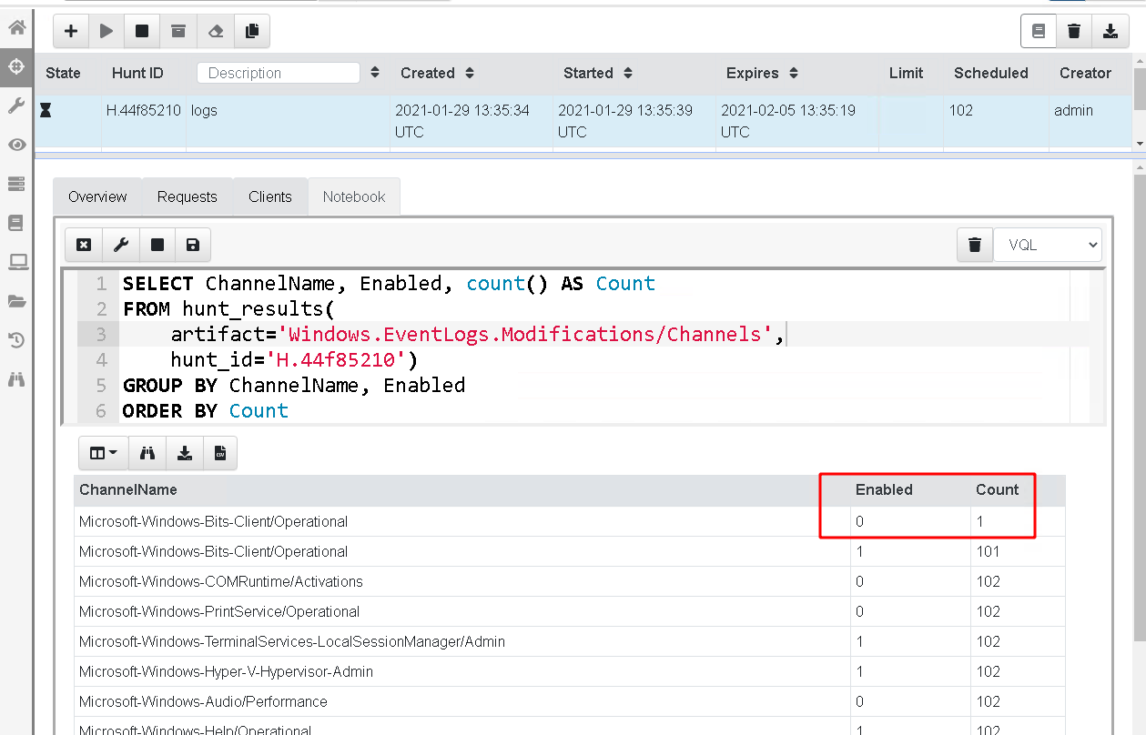 In the above screenshot I ran a hunt on about 100 endpoints which have the default enabled logs, and a single endpoint with that log disabled. The stacking operation (GROUP BY) immediately reveals the outliers.