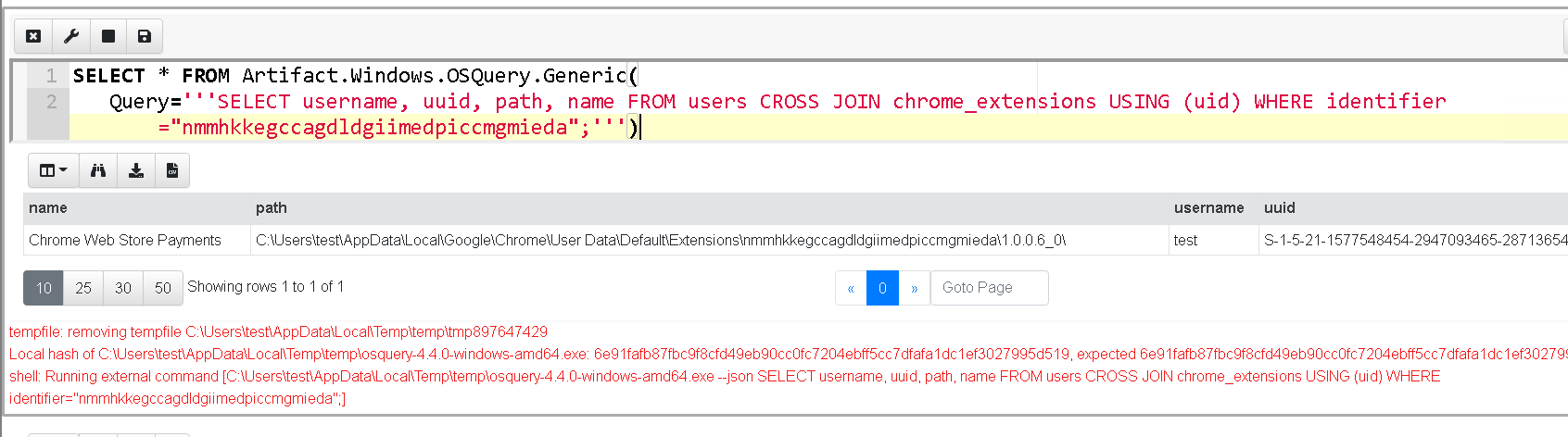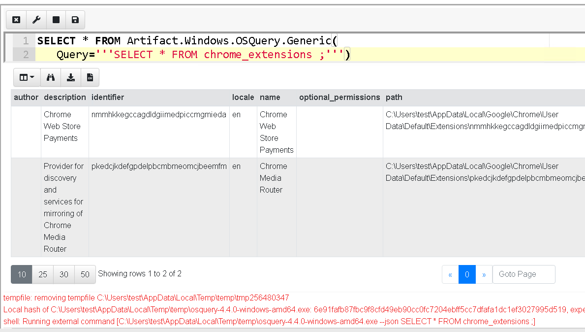 Let’s take a simple example: an OSQuery query designed to display information about specific chrome extensions.