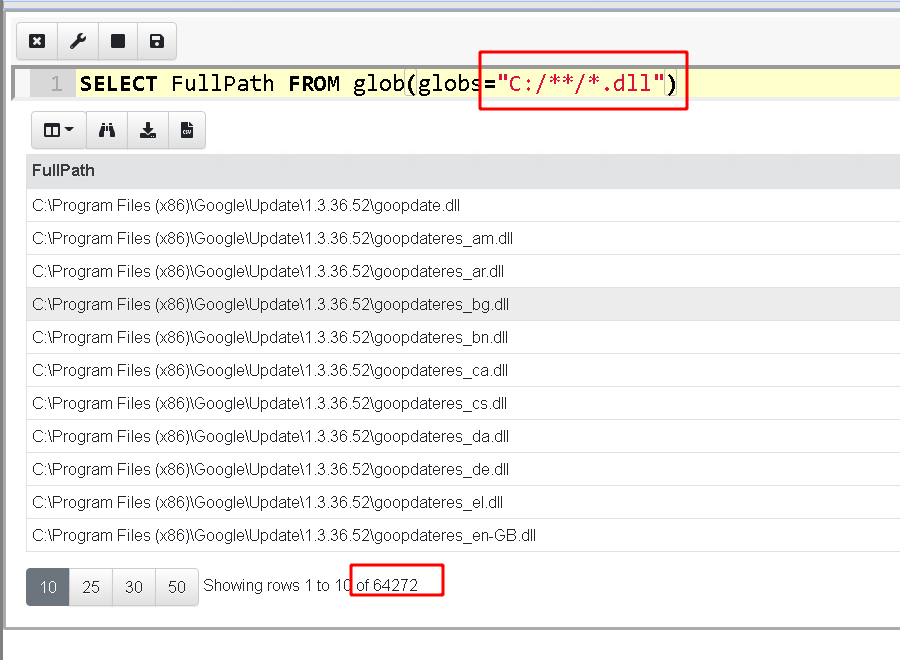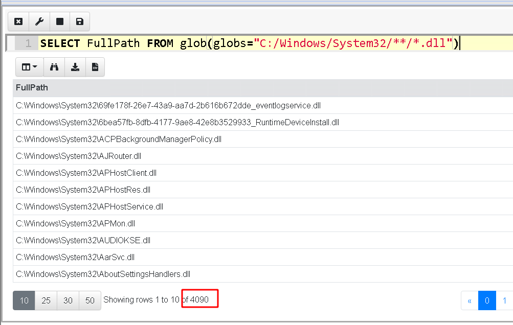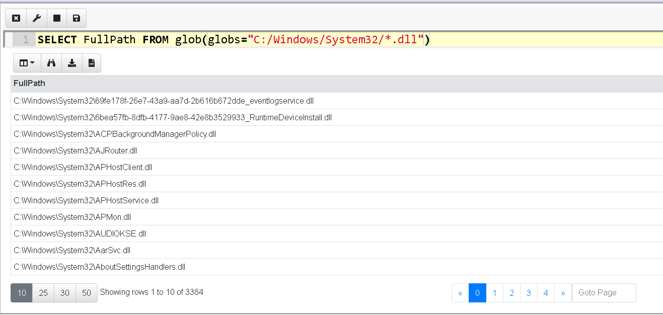 SELECT * FROM glob(globs="C:\\Windows\\System32\\*.dll")