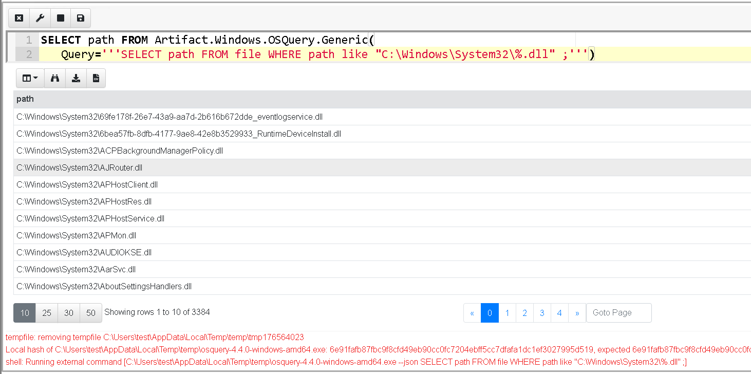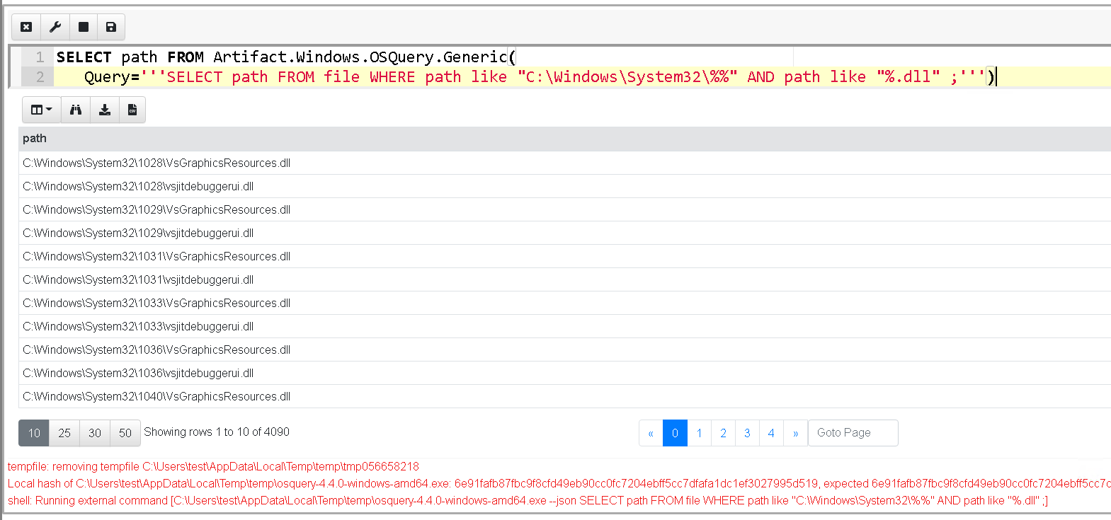 If you tried this you would immediately see a difference in performance — the VQL example took less than a second to return 3384 rows while OSQuery took over 6 sec to return the same data. While 6 seconds is not too bad, this gets worse when we try to fetch more dlls from the disk…