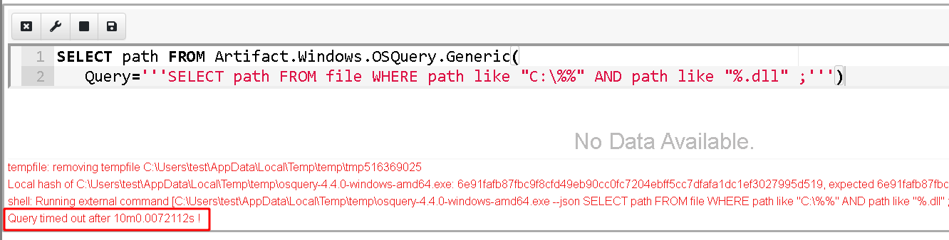 This time OSQuery takes 52 seconds to return the same number of rows. If you keep an eye on the task manager you would also see an increasing memory footprint for OSQuery because it queues up all rows in memory before returning them, so the more rows it returns the more memory it uses. If we now increase the size of the glob, to return all dlls on the system the query times out without returning any data at all!