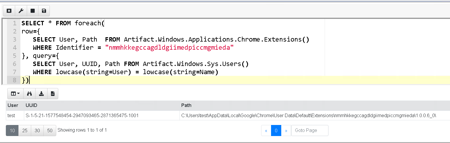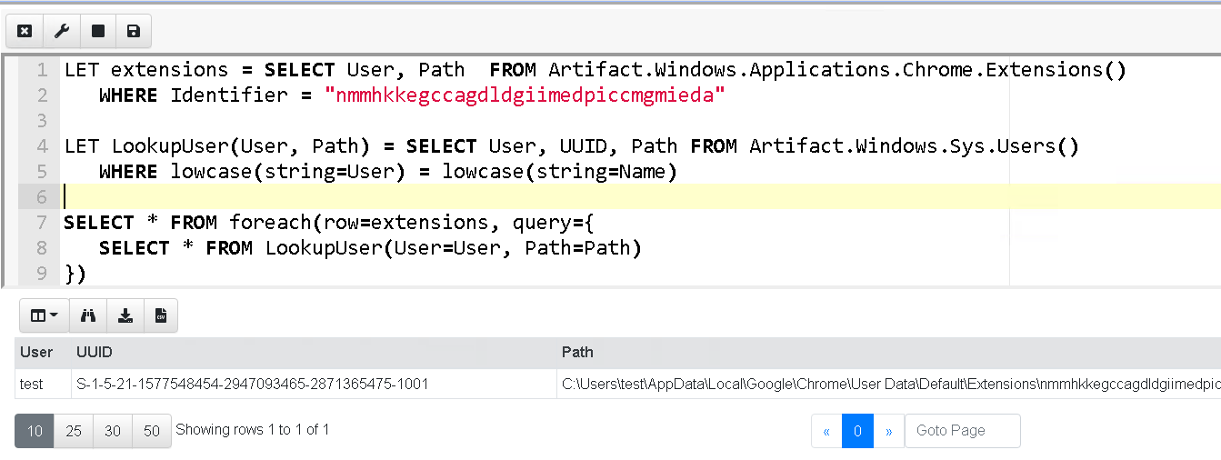 The equivalent VQL simply runs two queries — for each row emitted by the Windows.Applications.Chrome.Extensions artifact that matches the extension of interest, we iterate over all the users, and select the user record of the user matching the relevant record so we can display its UUID.