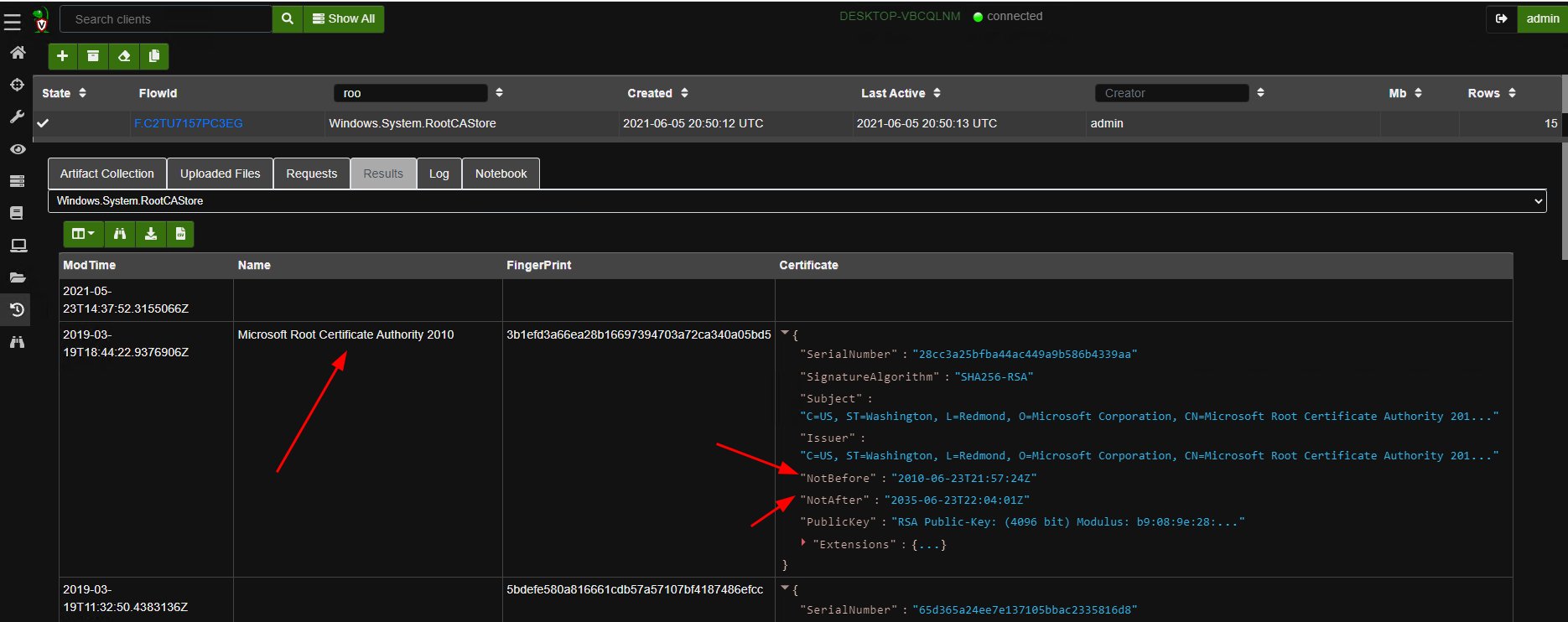 We can use Velociraptor’s built in binary parser to automatically parse these keys. The details are in the Windows.System.RootCAStore artifact but collecting it from the endpoint is easy