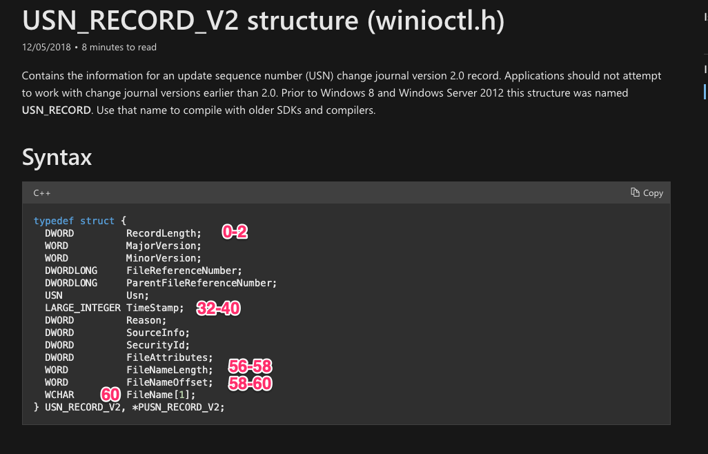 In order to carve the USN record from the disk, we need to understand what a USN record looks like. Our goal is to come up with a set of rules that identify a legitimate USN journal record with high probability.