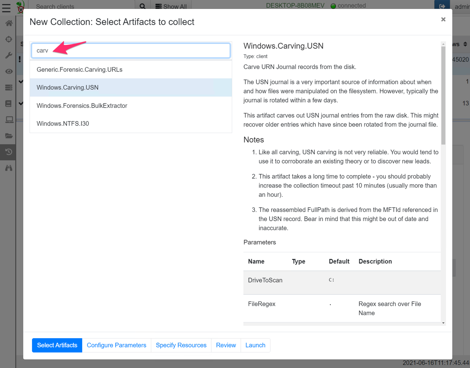 You can see the full details of the artifact here but collecting this artifact from the endpoint is easy — simply create a new collection and select the Windows.Carving.USN artifact.
