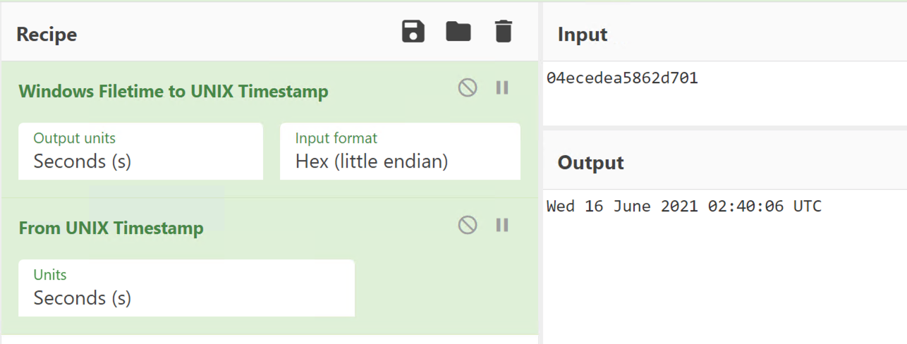 Let’s take a look at the timestamp above. I will use CyberChef to convert the hex to a readable timestamp.