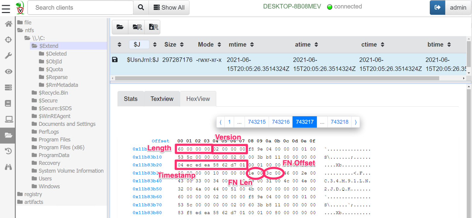 The Yara signature will retrieve reasonable candidates for our carver. Now we need to parse the record properly. In order to do that I will use Velociraptor’s binary parser. First I will write a profile to describe the USN struct and apply the parser to extract the MFT entry ID from the record. I can then use Velociraptor’s built in NTFS parser to resolve the MFT entry ID to a full path on disk.