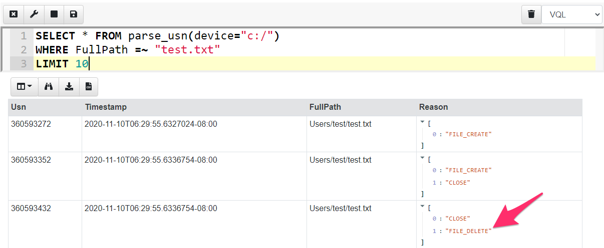 The USN journal is a unique source of evidence because it can provide a timeline for when files were deleted, even if the file itself is no longer found on the system. In the screenshot below I parse the USN journal using Velociraptor’s built in USN parser. I filter for all interactions with the test.txt file and find that it has been removed (The FILE_DELETE reason).