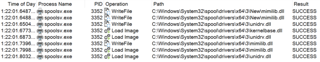 So a successful exploit results in the copying of a new dll into the spool directory and the dll being loaded by the spoolsv.exe service process.
