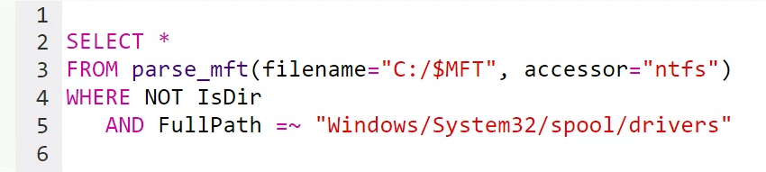The above query parses the entire master file table (MFT) and returns information about those files in the spool directory.