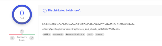 Many binary classification services are not able to verify catalog signatures, therefore displaying the file as unsigned. This can be confusing for analysts who can not quickly triage the file as legitimate. The below screenshot shows a VirusTotal search for a legitimate Microsoft print driver. Although the file is not detected as malicious, it is not shown as signed either.