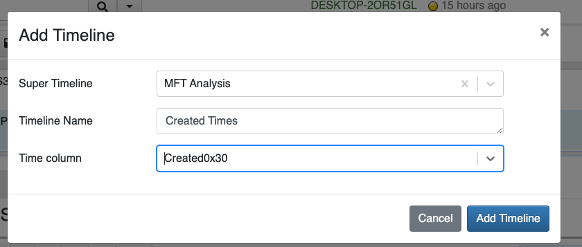 When adding a timeline to a super timeline, I need to specify the Supertimeline’s name (If there is no super timeline yet, I can create a new one). Then I can specify the child timeline’s name and a time column to use as the index.