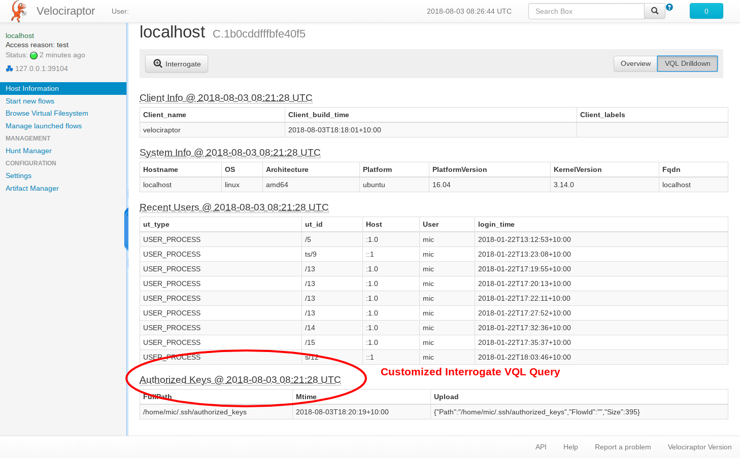 Normally Velociraptor collects minimal information from the client upon interrogation (i.e. when the client first enrols or when interrogated periodically). However it is very easy to customize this collection depending on local site requirements. In this section we work through a step by step example of extending the Velociraptor interrogate flow.