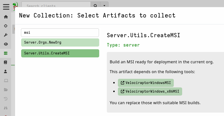 The first approach makes use of our official release MSI and inserts your client configuration into the file without changing anything else. None of the MSI settings are changed when using this method. It is most suitable for users who just want to get up and running quickly. Since it is so commonly done we have provided a built-in server artifact which allows this to be done via the Velociraptor web GUI. However it can also be done on the command line using our CLI, similar to how we create installer packages for Linux and macOS. The CLI option makes it possible to automate the process using external tools or CI pipelines.
