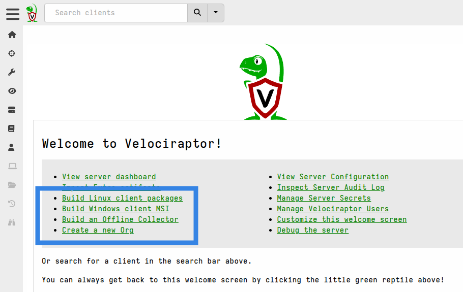 While it’s important to understand client installer packaging, in recent versions of Velociraptor we have simplified this process by automating it via built-in server artifacts. You will find links to run these artifacts on the Welcome page.