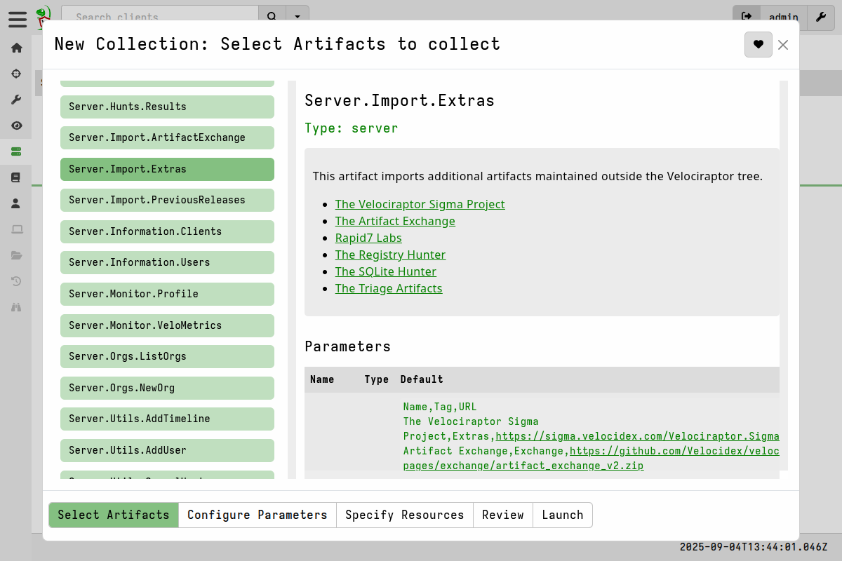 To get these external artifacts into your Velociraptor server’s artifact repository, we have a built-in server artifact which will download them from any or all of the external sources. Here’s how to do that:
