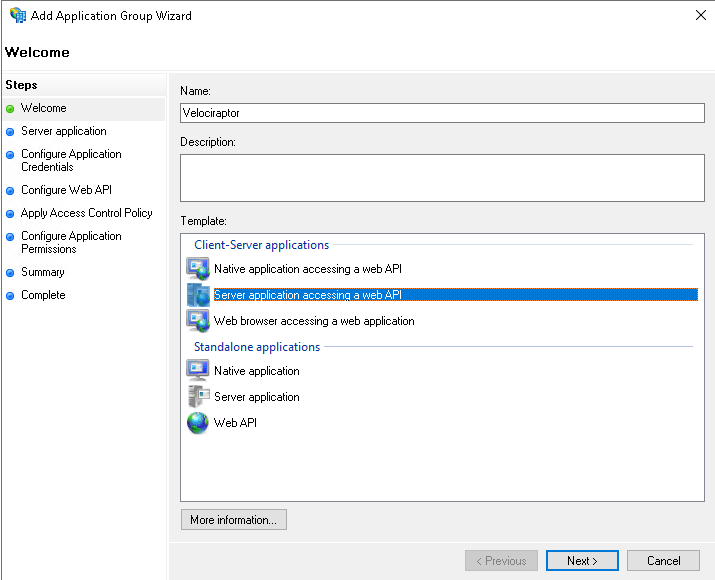 Enter a name and select Server Application accessing a web API